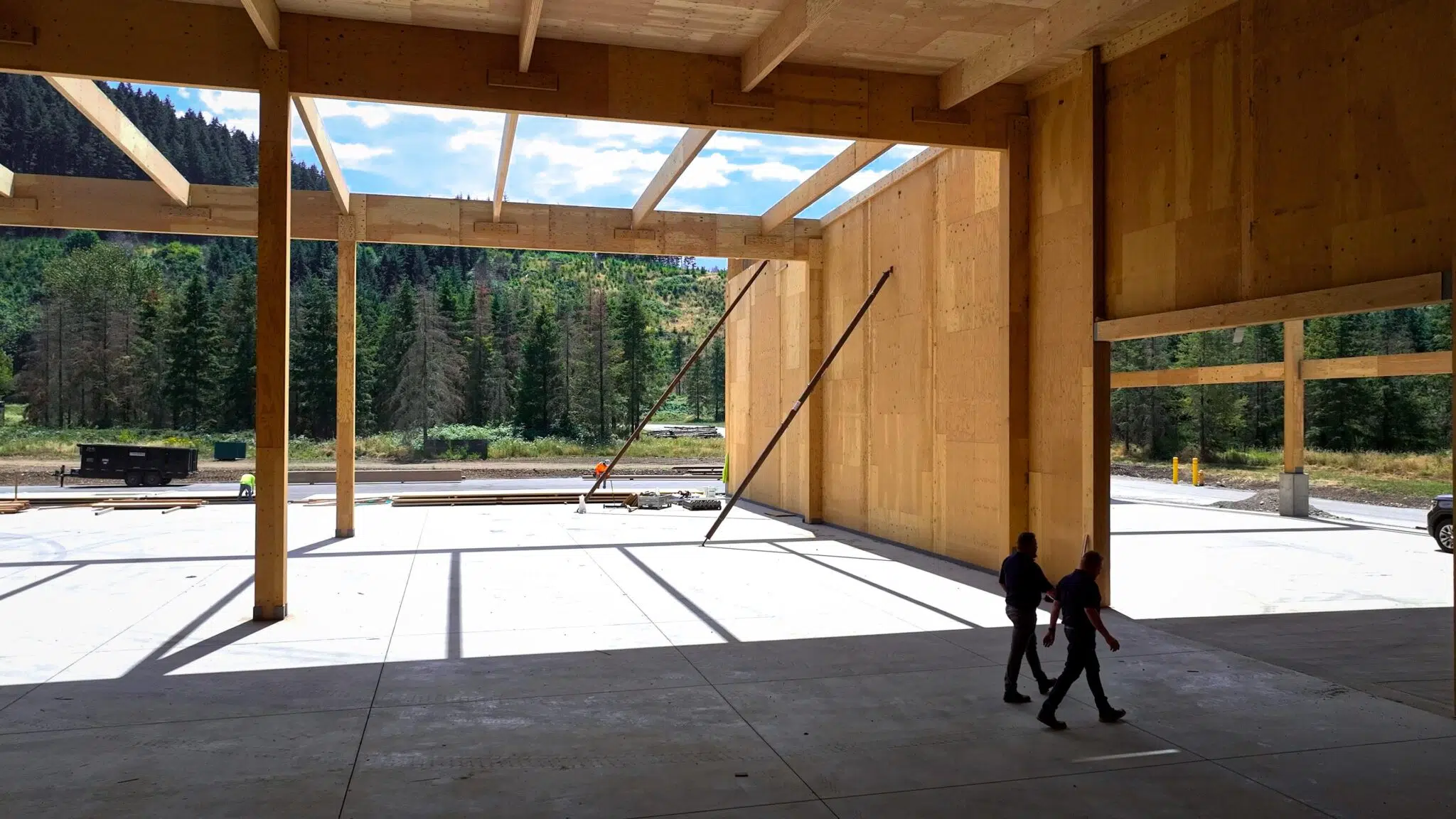 Workers at Freres Engineered Wood in Oregon’s Santiam Canyon manufacture mass timber panels and wooden beams that can be used in place of steel and concrete in the construction of large commercial and multifamily buildings.